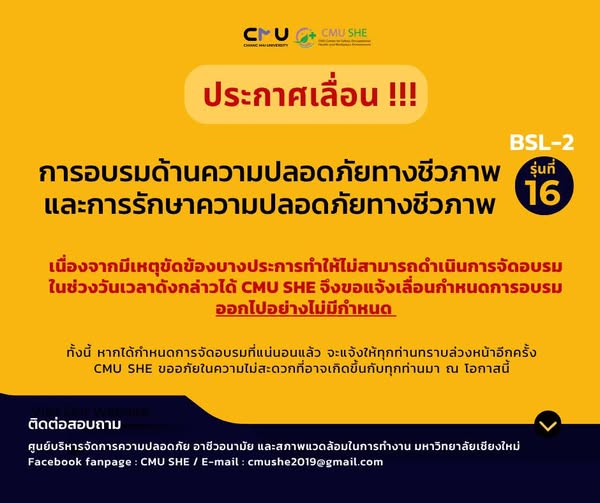 เนื่องจากมีเหตุขัดข้องบางประการทำให้ไม่สามารถดำเนินการจัดอบรมในช่วงวันเวลาดังกล่าวได้ CMU SHE จึงขอแจ้งเลื่อนกำหนดการอบรมดังกล่าวออกไปอย่างไม่มีกำหนด ทั้งนี้ CMU SHE จะแจ้งกำหนดการอบรมฯ อย่างเป็นทางการ พร้อมเปิดระบบลงทะเบียนเข้าร่วมอบรมฯ ล่วงหน้าอีกครั้ง